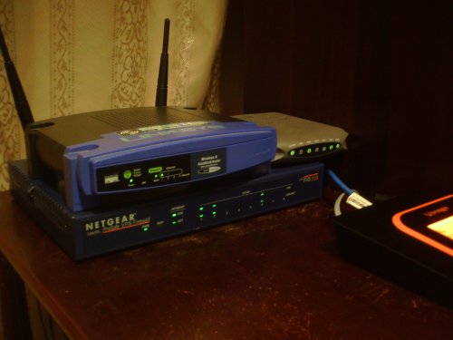The router is actually a VPN Firewall from Netgear (its the nice lookin' box on the bottom with a dent on the left).
